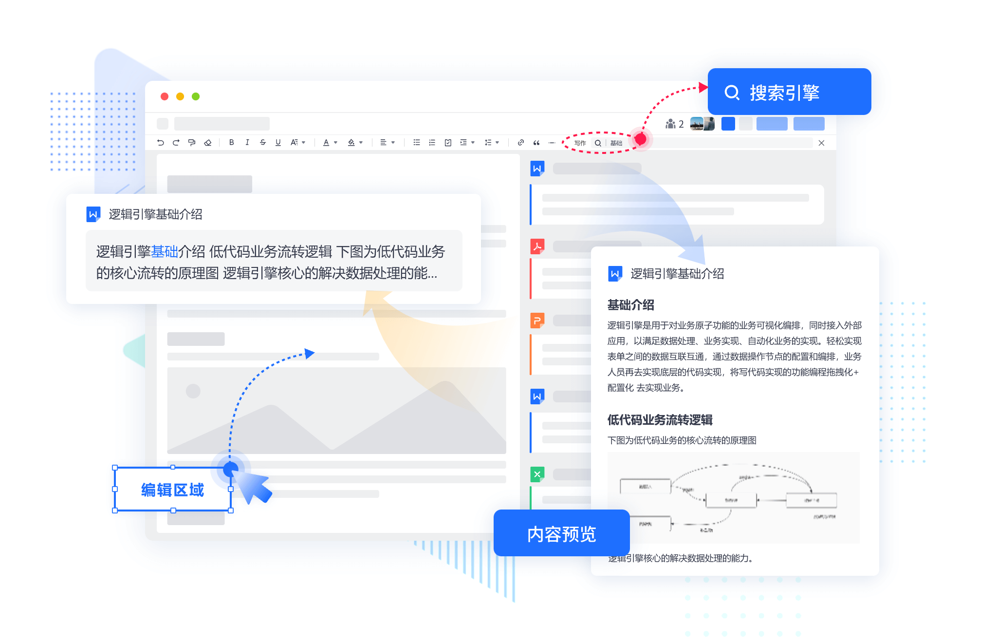 利用两个屏幕或同时进行编辑工作的功能,左侧编辑区,右侧搜索引擎+内容预览,基于内容的搜索、文档查看,便于对容的对比,支持富文本、Word、Excel、PPT等编辑。